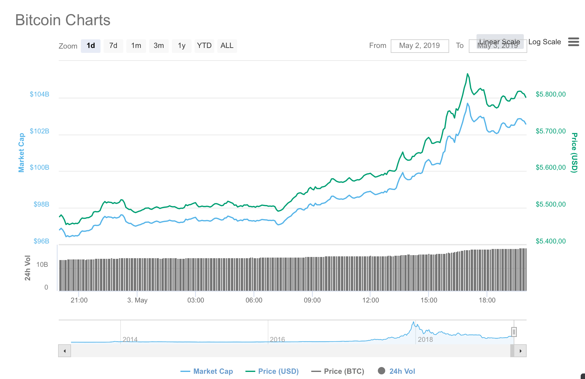 Theo CCN.com: Giá bitcoin đã tăng từ 5.341 đô la lên 5.801 đô la trên Coinmarketcap, thiết lập mức cao mới năm 2019.