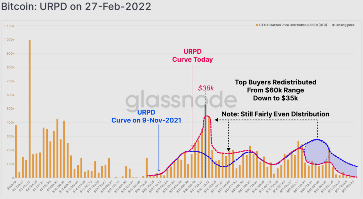 Theo phân tích của Glassnode về chỉ số URPD, cho thấy sự phân phối nguồn cung coin ở mức giá mà nó di chuyển lần cuối trên chuỗi, “việc phân phối chính dường như đến từ các nhà đầu tư đã mua phạm vi 60.000 USD trở lên” và gần đây đã bán trong Khoảng giá từ 35,000 USD đến 38,000 USD.