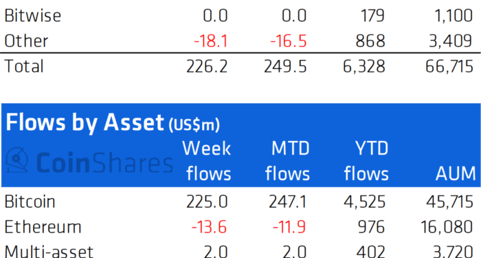Bitcoin đã chứng kiến dòng tiền vào tổng cộng 225 triệu đô la Mỹ, chiếm phần lớn tổng số dòng tiền vào.