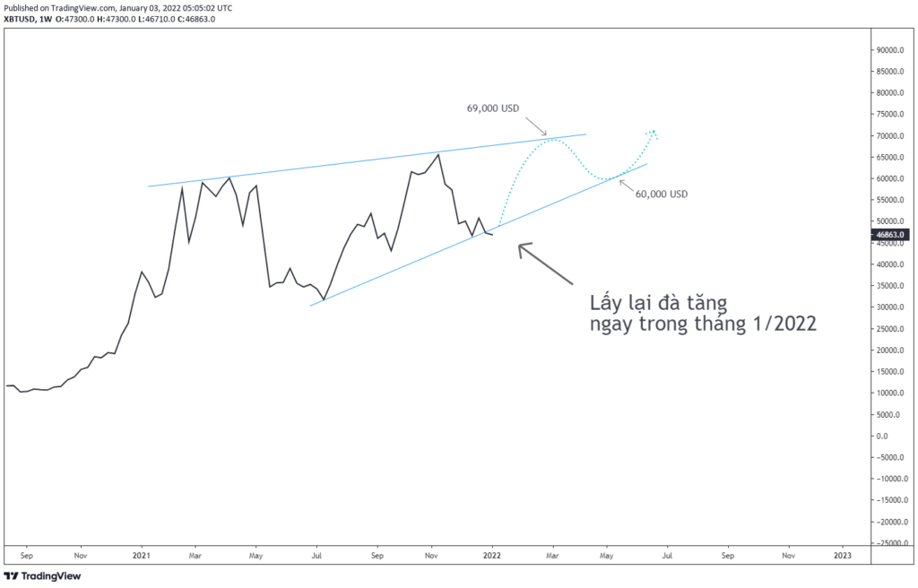 - Theo đó, giá sẽ một lần nữa test lại đỉnh 69,000 USD thậm chí đạt đỉnh cao hơn. Nhưng tạm thời về lại 60,000 USD sau đó tăng tiếp cũng trong năm 2022.