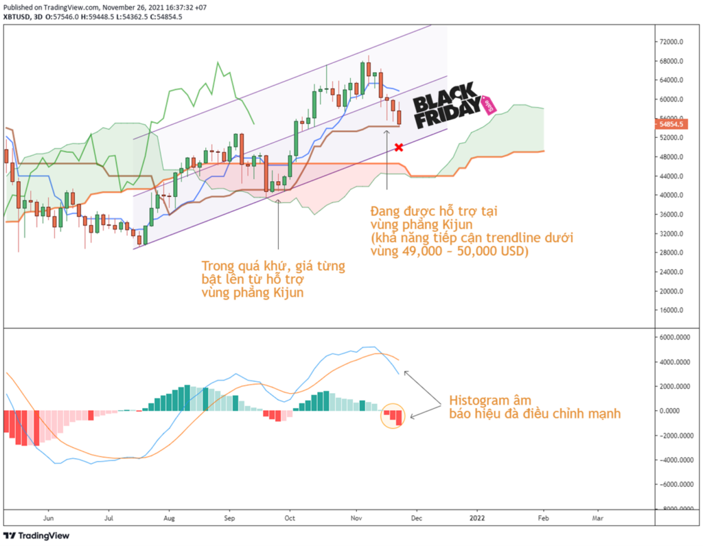 Hôm nay Bitcoin điều chỉnh về dưới 55,000 USD ngay trong dịp Black Friday những ngày cuối tháng 11/2021. Quan sát từ phân tích kỹ thuật gợi ý một vài kịch bản khả dĩ như sau.