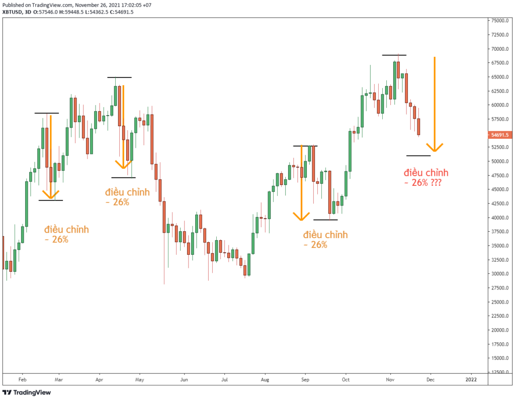 - Trong cả năm nay, mỗi lần Bitcoin bước vào một đợt điều chỉnh thường dừng lại ở -26%. Chỉ có đợt điều chỉnh hồi tháng 8 là đến gần -50%. Hiện tại, nếu BTC điều chỉnh từ 68,000 USD về tận 50,000 USD tức là đã điều chỉnh đến ngưỡng -26%.