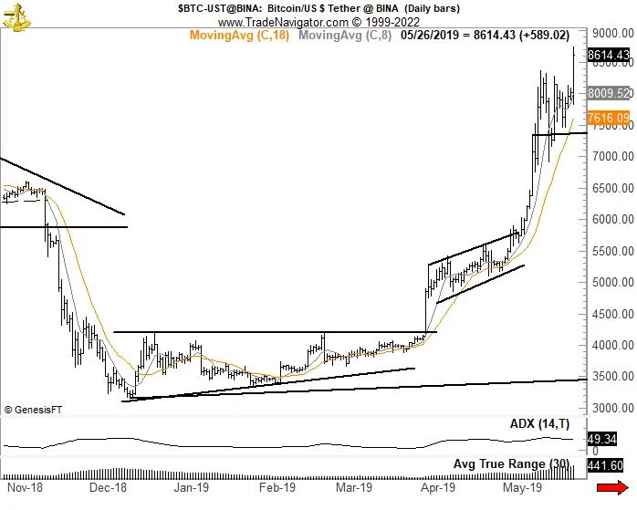 Trước biến động đóng nến tuần cao nhất 2022 trên, Peter Brandt cho rằng nến pump hôm qua cũng tương tự như mô típ hồi 2019 – khi thị trường trải qua giai đoạn ảm đảm nhất.