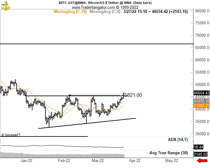Bitcoin vừa đóng nến tuần ở mức giá 46,800 USD, đây là mức giá đóng cửa khung tuần cao nhất kể từ đầu năm 2022 đến nay.