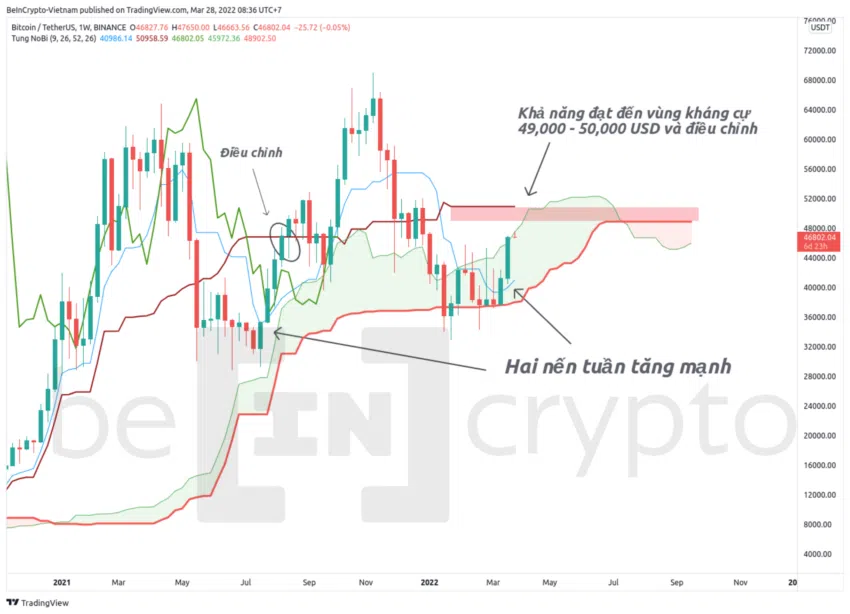 Quan sát trên cho thấy Bitcoin đang hội tụ về mức trung bình, tức đường trung bình cộng tenkan và đường span2. Điều này cũng đã từng xảy ra tương tự như năm 2021 theo dạng hai nến tăng mạnh và nến tăng tuần thứ ba chạm tenkan rồi điều chỉnh (như hình minh hoạ).