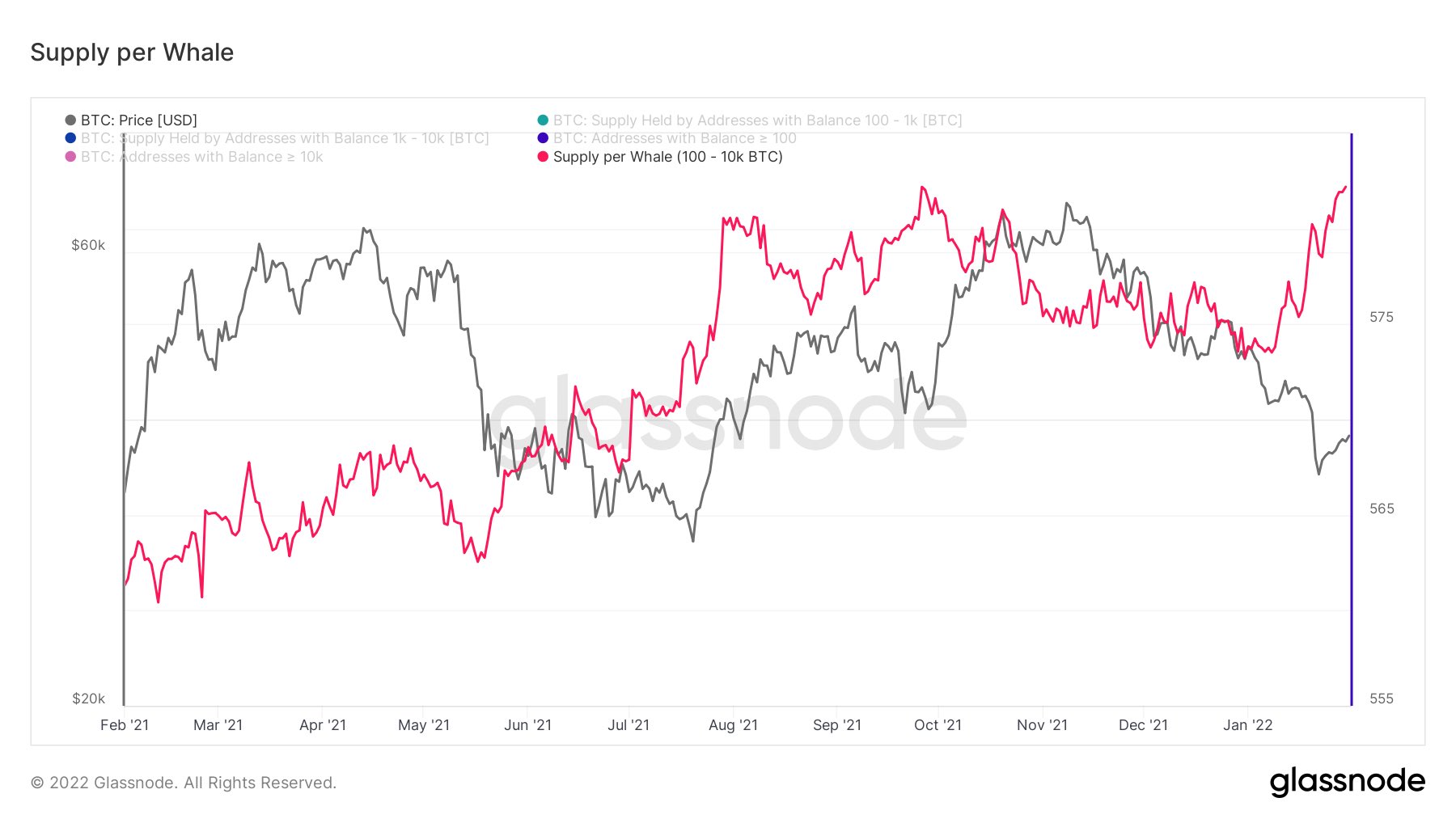 Nhìn chung, phần nguồn cung BTC trên mỗi ví cá voi hiện đang ở mức cao nhất trong một thập kỷ, dữ liệu từ công ty phân tích chuỗi trực tuyến Glassnode cho thấy.