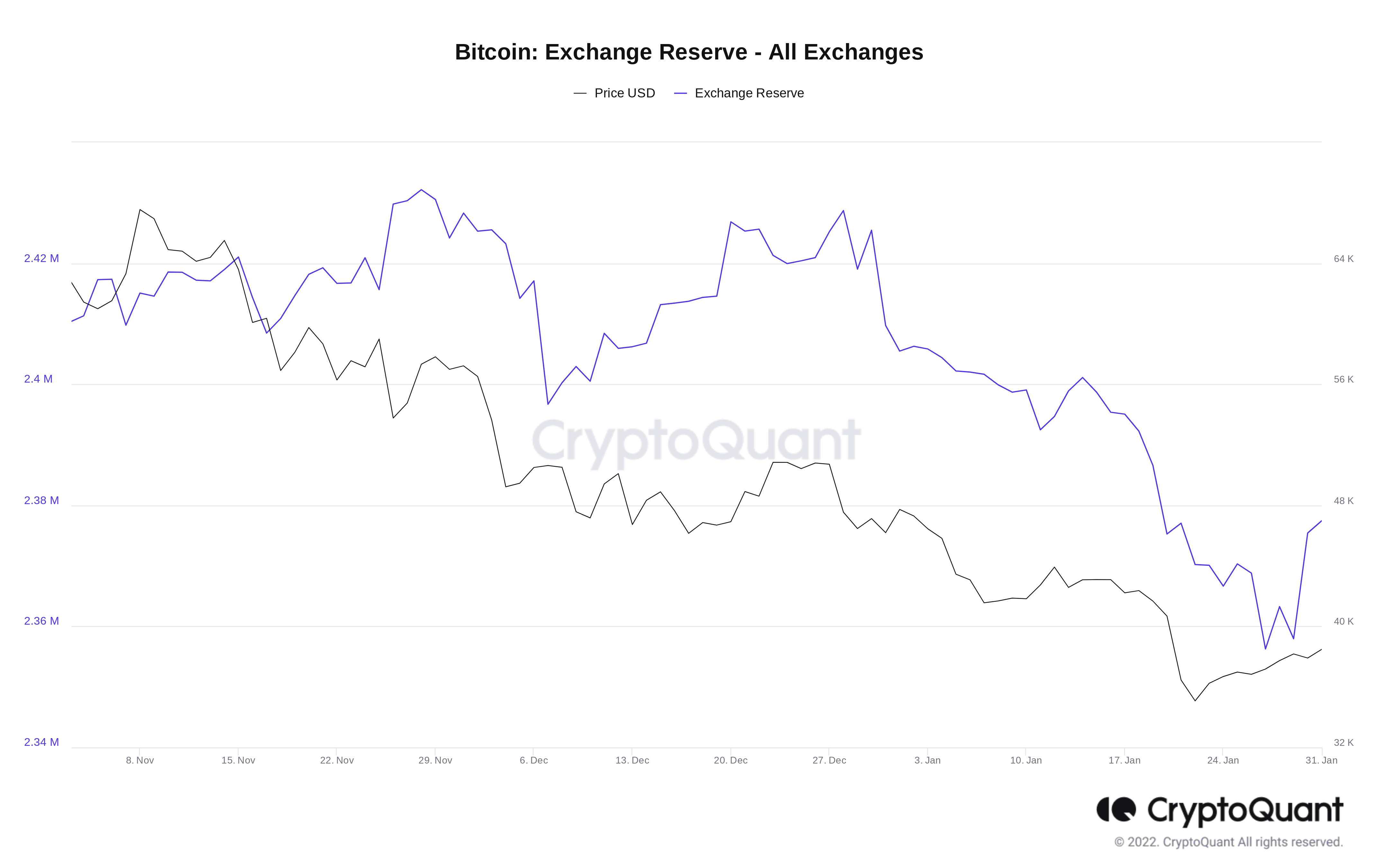21 nền tảng được theo dõi bởi công ty phân tích chuỗi trực tuyến CryptoQuant đã thấy số dư của họ tăng từ 2,357 triệu BTC vào ngày 29 tháng 1 lên 2,377 triệu BTC vào ngày 31 tháng 1, ngày mới nhất dữ liệu hiện có sẵn.