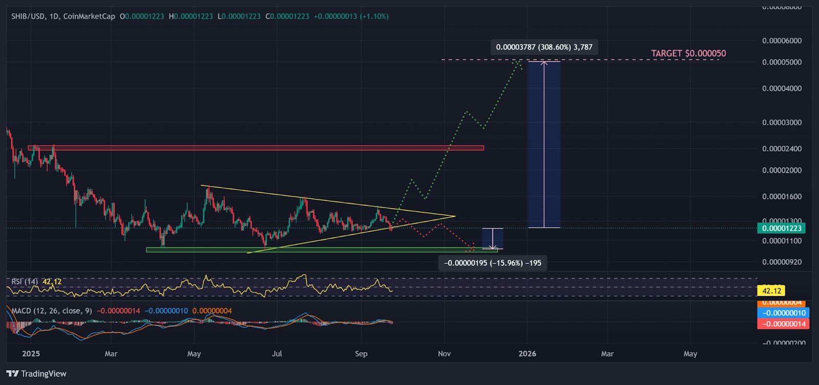 Trên biểu đồ ngày, SHIB đang đi ngang trong mô hình tam giác cân quanh mức $0,00001223.