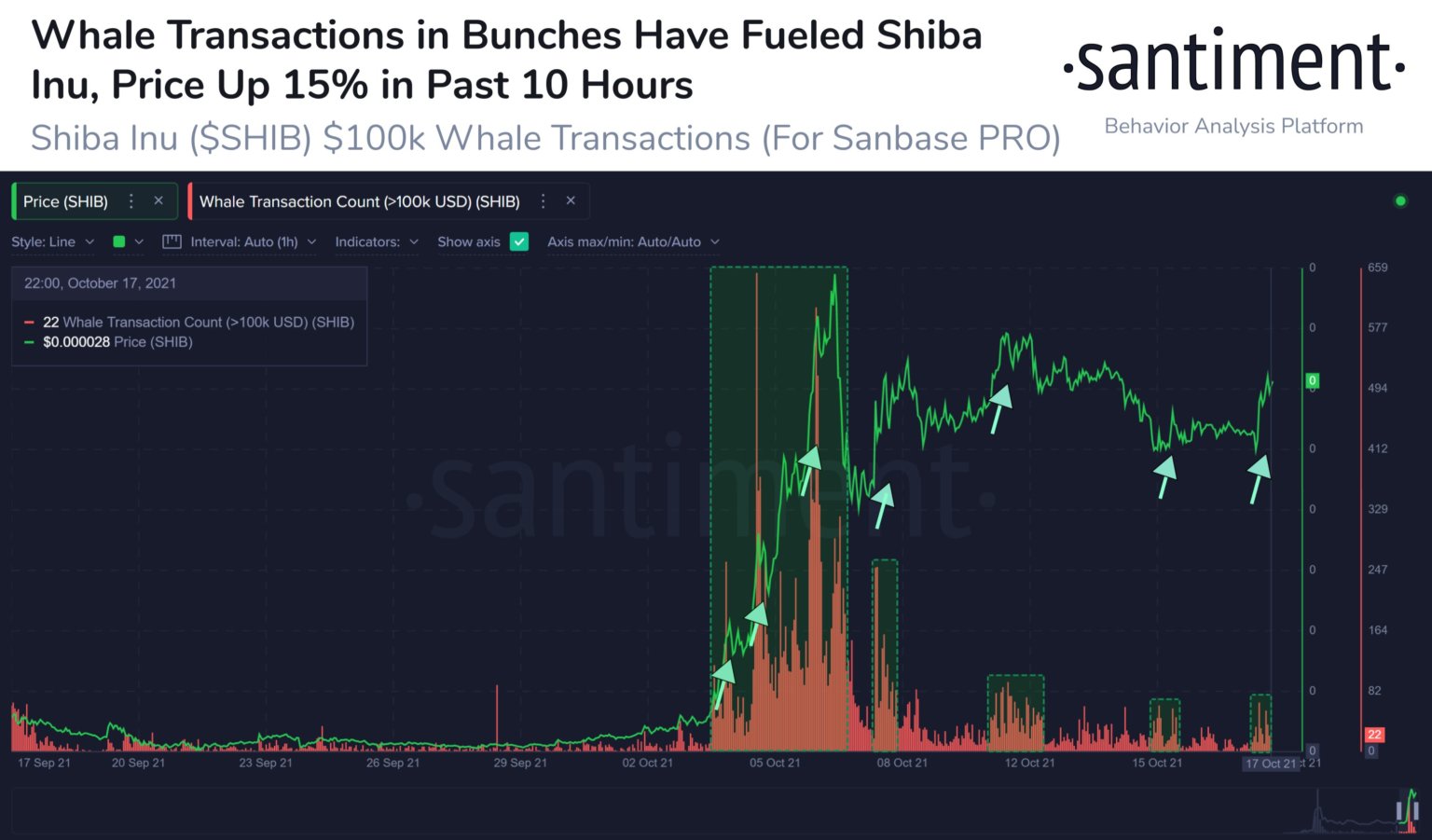 Dữ liệu từ công ty phân tích tiền điện tử Santiment cho thấy cá voi Shiba Inu đứng sau mọi đợt bơm giá kể từ khi SHIB cất cánh lần đầu tiên vào tháng này.
