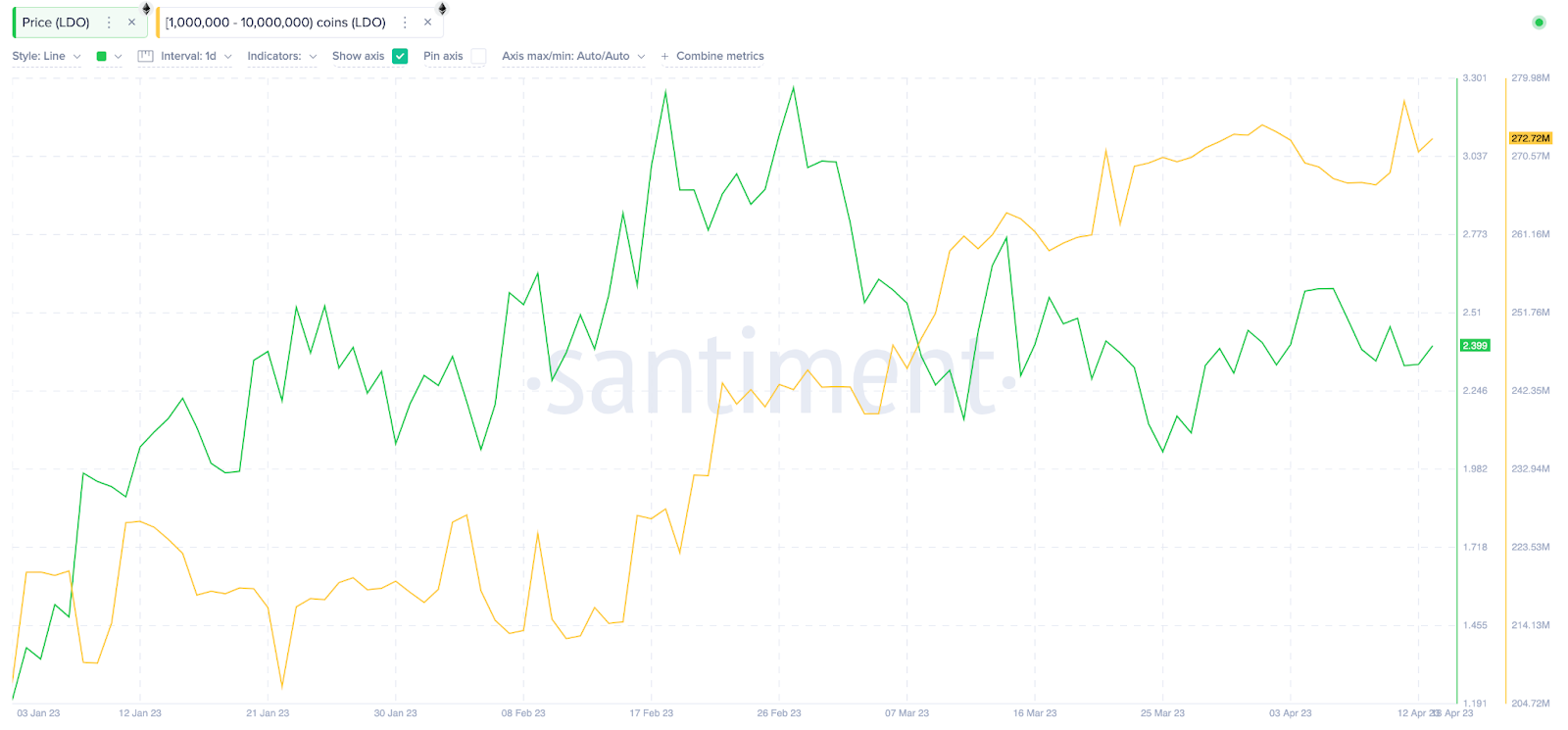 Trong những tuần gần đây, LDO coin đã chứng kiến đà mua tăng lên từ những con cá voi tiền điện tử đang nắm giữ từ 1 triệu đến 10 triệu LDO. Biểu đồ bên dưới cho thấy cá voi đã mua gần 33 triệu token như thế nào trong khoảng thời gian từ ngày 5 tháng 3 đến ngày 12 tháng 4. Tại thời điểm viết bài, giá trị thị trường là 2,39 USD, số token tích lũy trị giá khoảng 80 triệu USD.