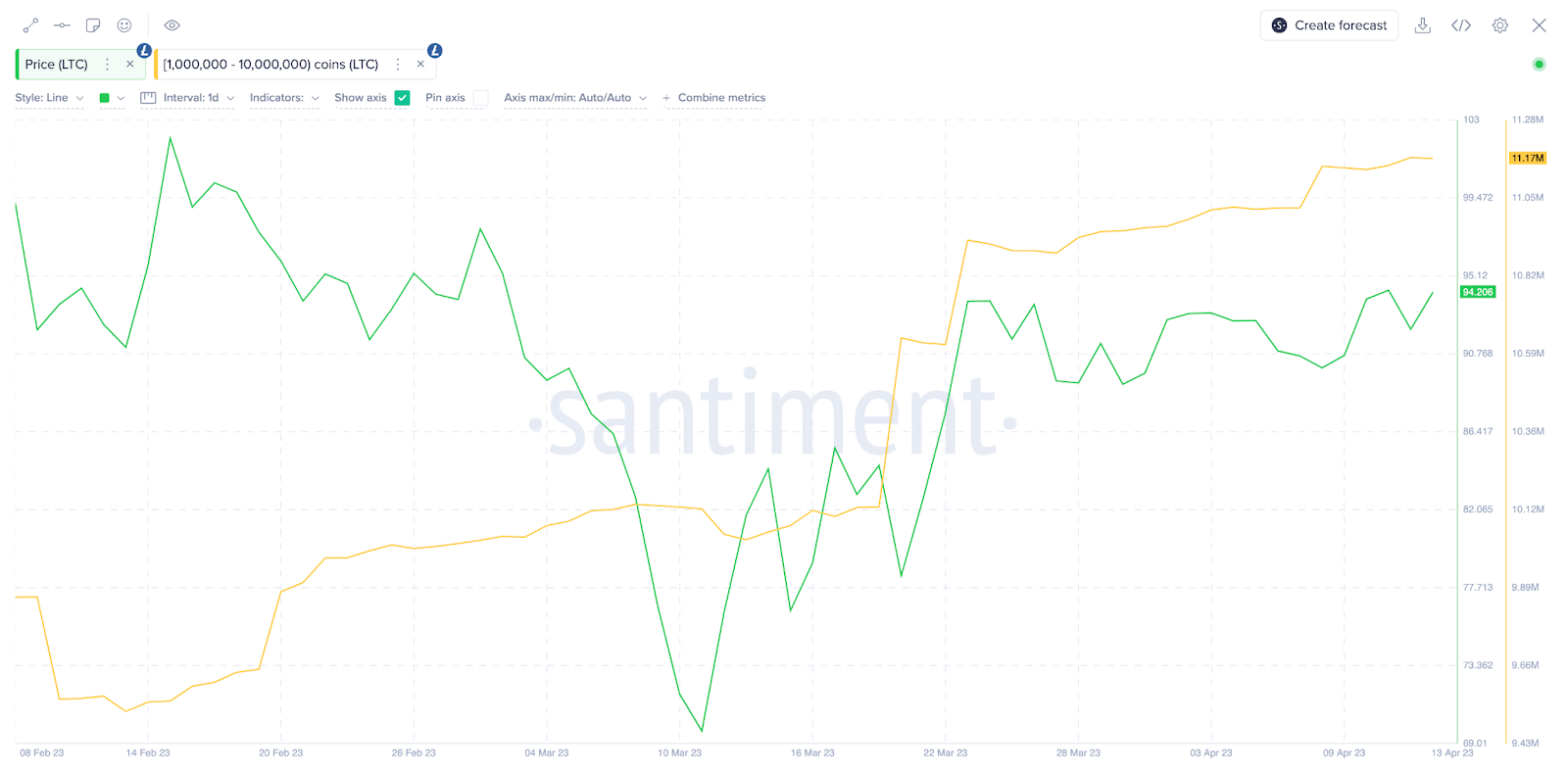 Vào ngày 15 tháng 2, Litecoin đã nhanh chóng vượt qua mức 100 USD lần đầu tiên kể từ tháng 5 năm 2022. Tuy nhiên, đợt tăng giá này đã diễn ra trong thời gian ngắn khi LTC nhanh chóng giảm xuống dưới 70 USD vào ngày 11 tháng 3. Điều thú vị là sự biến động này đã không ngăn cản được nhóm cá voi tiền điện tử nắm giữ 1 triệu đến 10 triệu LTC.