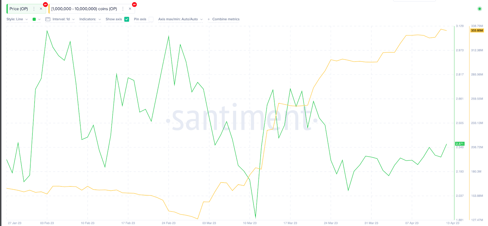 OP đã mang lại hiệu suất đáng kinh ngạc trong tuần qua, nhưng dữ liệu on-chain cho thấy cá voi tiền điện tử vẫn lạc quan. Từ ngày 1 tháng 3 đến ngày 12 tháng 4, những con cá voi có từ 1 triệu đến 10 triệu OP trong số dư ví của họ đã thêm 256 triệu token.