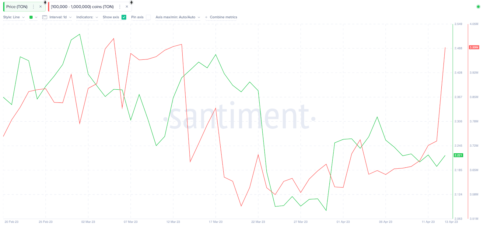 Theo công ty pháp y blockchain Santiment, những người nắm giữ cá voi TON đã quay trở lại chế độ tích lũy sau khi chốt lãi vào đầu tháng 3. Trong khoảng thời gian từ ngày 20 tháng 3 đến ngày 13 tháng 4, nhóm cá voi với số dư riêng lẻ từ 100.000 đến 1 triệu TON đã thêm 44 triệu coin khác.