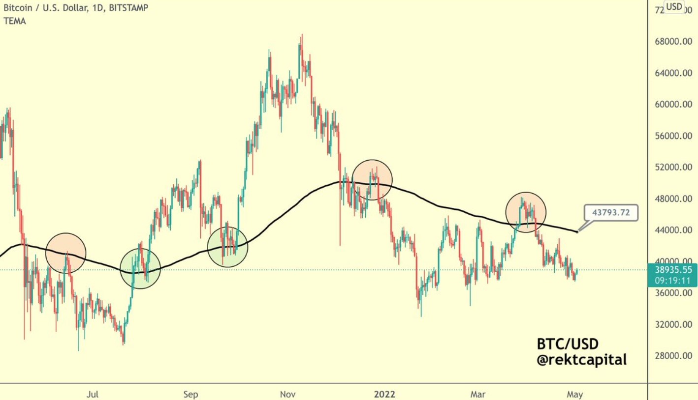 Theo nhà phân tích thị trường độc lập Rekt Capital, theo dõi mức đóng cửa trên đường trung bình động hàm mũ (EMA) 200 ngày là một cách dễ dàng để đánh giá điểm yếu hiện tại của Bitcoin. Nhà phân tích đã mô tả chỉ số này như một “chỉ báo về tình cảm của nhà đầu tư dài hạn đối với Bitcoin”.