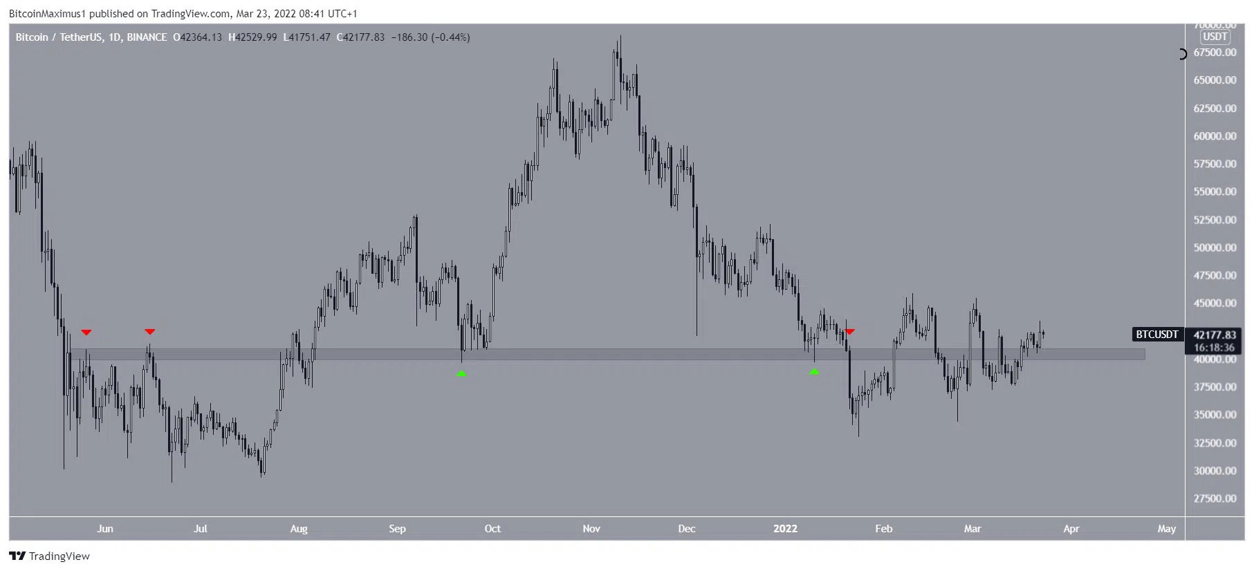Kể từ tháng 5 năm 2021, khu vực 40.500 USD đã đóng vai trò quan trọng trong việc xác định xu hướng giá BTC. Khu vực này hoạt động dưới dạng kháng cự hai lần (biểu tượng màu đỏ), trước khi chuyển sang hỗ trợ sau đó (biểu tượng màu xanh lá cây).
