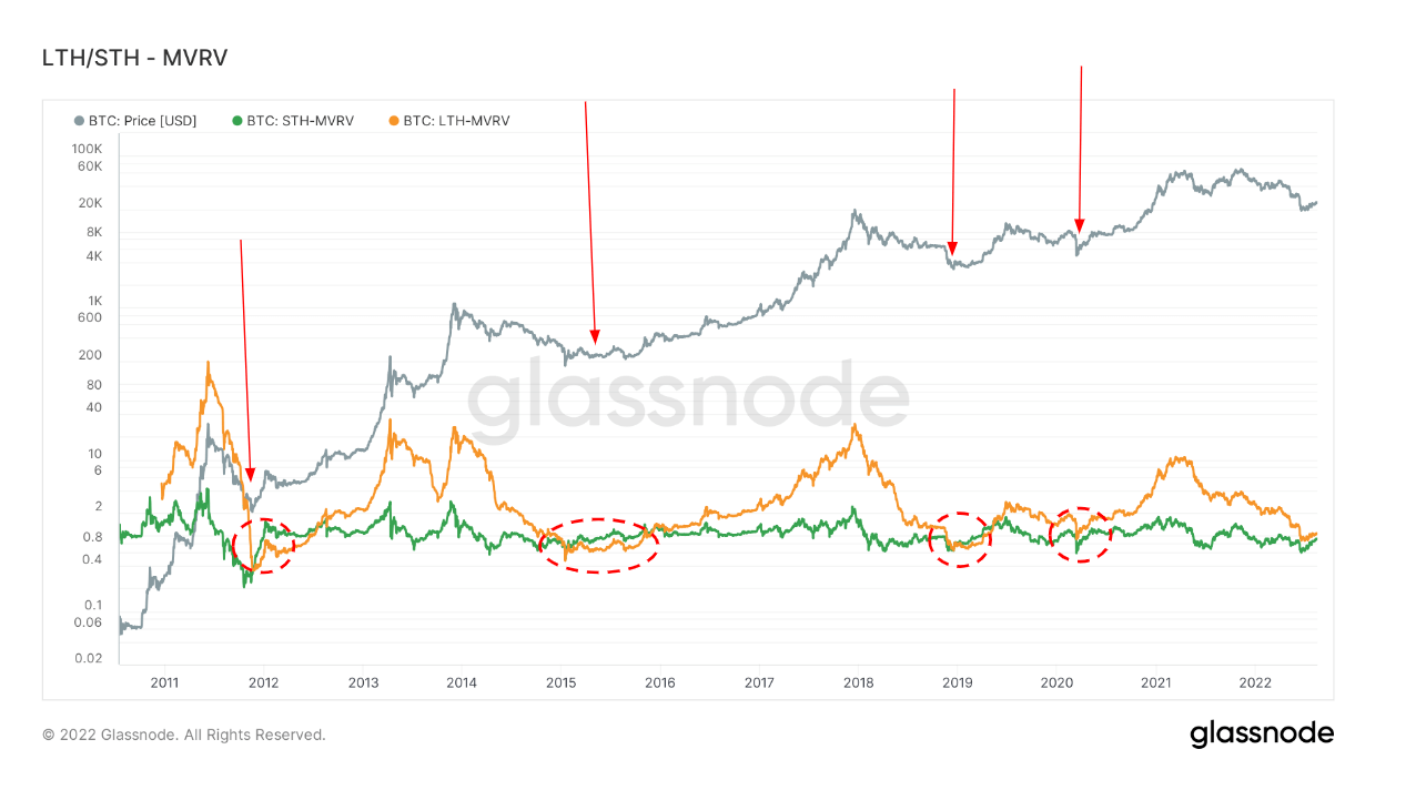 Bốn đáy chu kỳ trước đây được đặc trưng bởi sự hội tụ của các đường STH-MVRV và LTH-MVRV. Sự giao cắt như vậy vẫn chưa xảy ra.