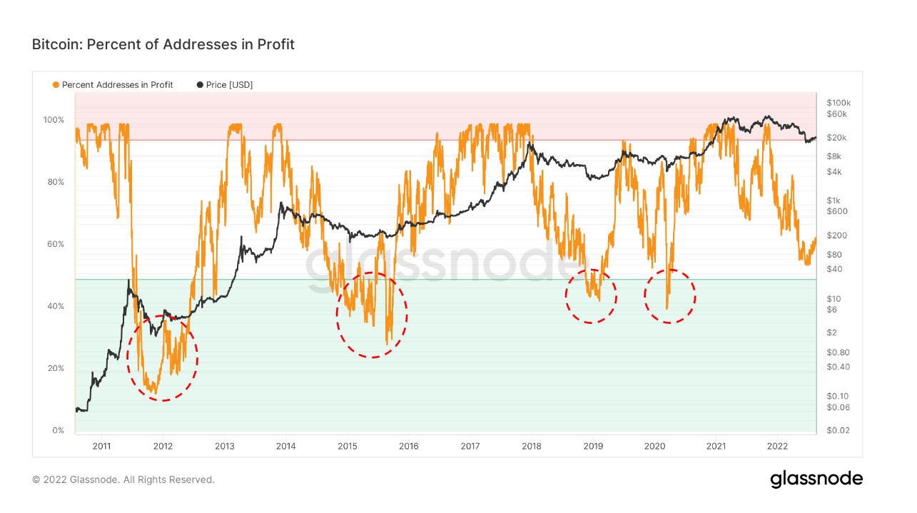 Trong mỗi lần chạm đáy chu kỳ trước đó, 50% hoặc ít hơn các địa chỉ Bitcoin đã bị thua lỗ. Biểu đồ dưới đây cho thấy mức đọc hiện tại là khoảng 58%, cho thấy giá BTC sẽ còn giảm nữa.