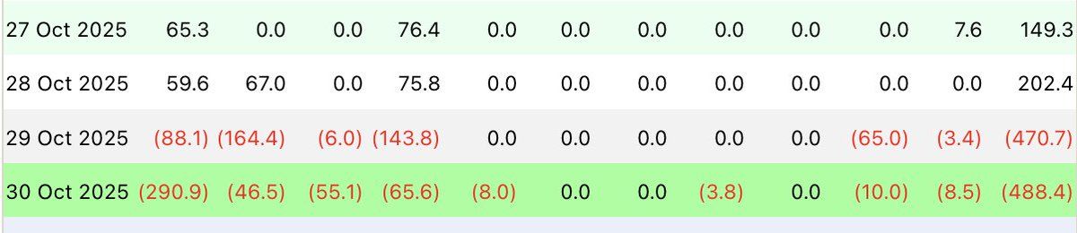 Institutions are still trimming risk, $BTC and $ETH spot ETFs saw heavy outflows, led by BlackRock’s $IBIT (-$291M) and $ETHA (-$118M), totaling $488M and $184M.