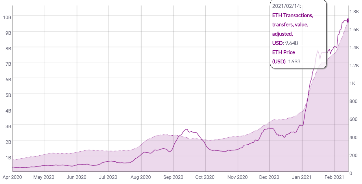 Dữ liệu Coin Metrics cho thấy các giao dịch và chuyển khoản trung bình trong 14 ngày đạt trên 9 tỷ đô la trong các giao dịch hàng ngày, tăng 32% so với tháng trước. Sự gia tăng đáng kể về giá trị giao dịch và chuyển nhượng này báo hiệu sức mạnh và cho thấy rằng giá của Ether là bền vững ở mức hiện tại.