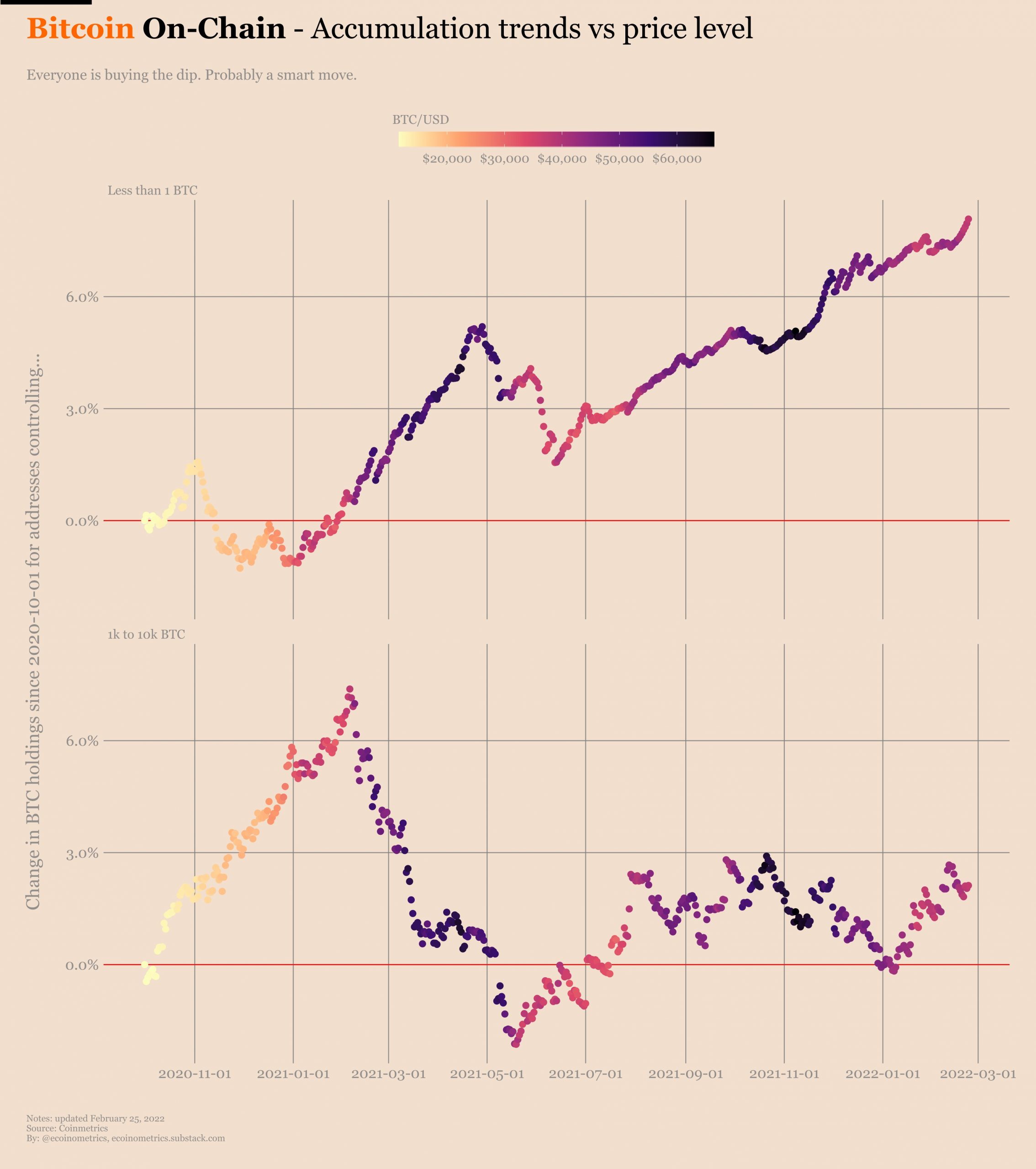 Tài nguyên dữ liệu Ecoinometrics đã chia các địa chỉ thành hai nhóm – một nhóm chứa ít hơn 1 BTC và nhóm còn lại có khoảng từ 1.000 BTC đến 10.000 BTC – lưu ý rằng cả hai nhóm đều đã “buy dip” Bitcoin và nói: