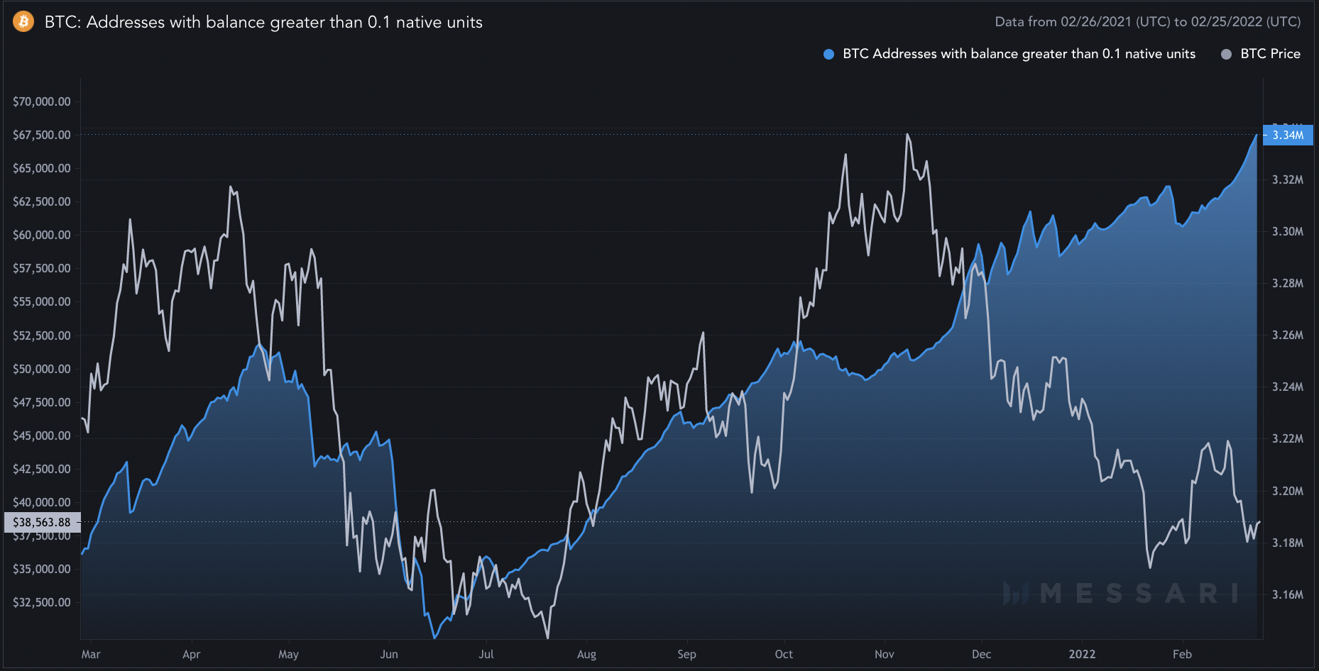 Số lượng địa chỉ Bitcoin có số dư lớn hơn 0,01 BTC (~ 400 USD) đạt mức cao kỷ lục 9,51 triệu, dữ liệu mới nhất từ Coin Metrics cho thấy. Trong khi đó, số lượng địa chỉ nắm giữ ít nhất 0,1 BTC (~ 4,000 USD) cũng đạt 3,34 triệu lần đầu tiên trong lịch sử.