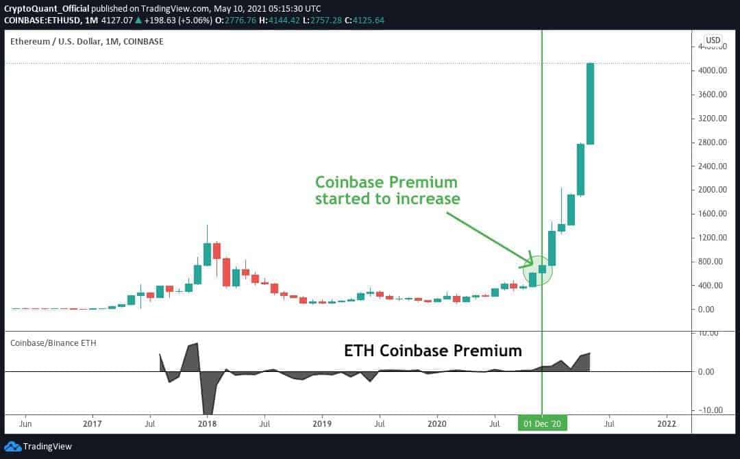 Giám đốc điều hành của CryptoQuant, Ki Young Ju, đã chỉ ra “mức phí bảo hiểm đáng kể” trên Coinbase, theo ông, đây là một trong những lý do có thể xảy ra nhất đằng sau sự tăng giá của Ethereum.