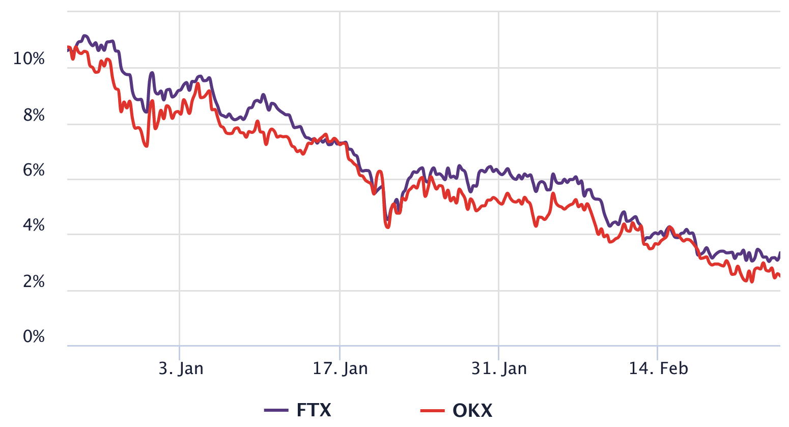 Mức dưới 5% là cực kỳ giảm giá, trong khi mức phí bảo hiểm hàng năm trên 12% cho thấy xu hướng tăng. Như được hiển thị ở trên, phí bảo hiểm tương lai giảm xuống dưới 5% vào ngày 9 tháng 2, cho thấy sự thiếu tin tưởng từ các nhà giao dịch chuyên nghiệp.