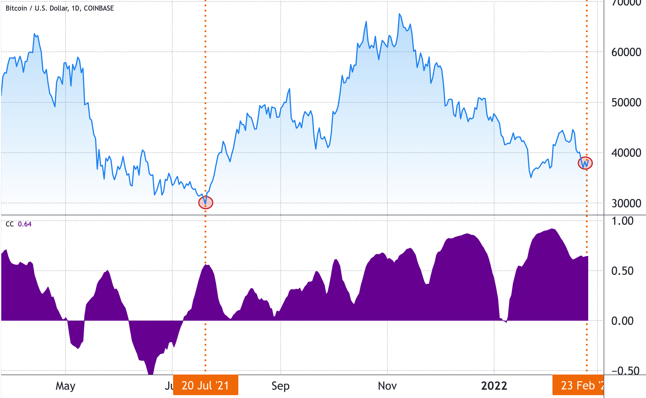 Giá Bitcoin (BTC) được giao dịch giảm 23% trong 8 ngày sau khi không thể phá vỡ ngưỡng kháng cự 45.000 USD vào ngày 16 tháng 2. Mức đáy 34.300 USD vào ngày 24 tháng 2 xảy ra ngay sau khi xung đột Nga-Ukraine leo thang, gây ra một đợt bán tháo mạnh đối với các tài sản rủi ro.