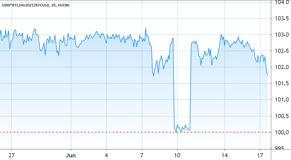 Các hợp đồng tháng cố định thường giao dịch ở mức phí bảo hiểm nhẹ, cho thấy rằng người bán yêu cầu nhiều tiền hơn để giữ lại việc thanh toán lâu hơn. Hợp đồng tương lai cũng nên giao dịch ở mức phí bảo hiểm hàng năm từ 5% đến 15% trên các thị trường lành mạnh, phù hợp với lãi suất cho vay stablecoin. Tình huống này được gọi là “contango” (bù hoãn mua) và không dành riêng cho thị trường tiền điện tử.
