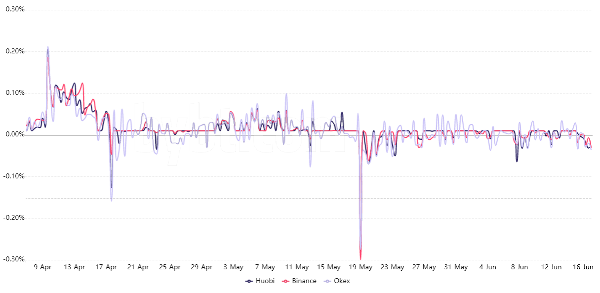 Kể từ ngày 24 tháng 5, tỷ lệ tài trợ đã dao động giữa 0,03% dương và 0,05% âm mỗi 8 giờ. Do đó, vào những thời điểm “giảm giá” nhất, vị thế short đã phải trả 1% mỗi tuần để duy trì vị thế của họ.