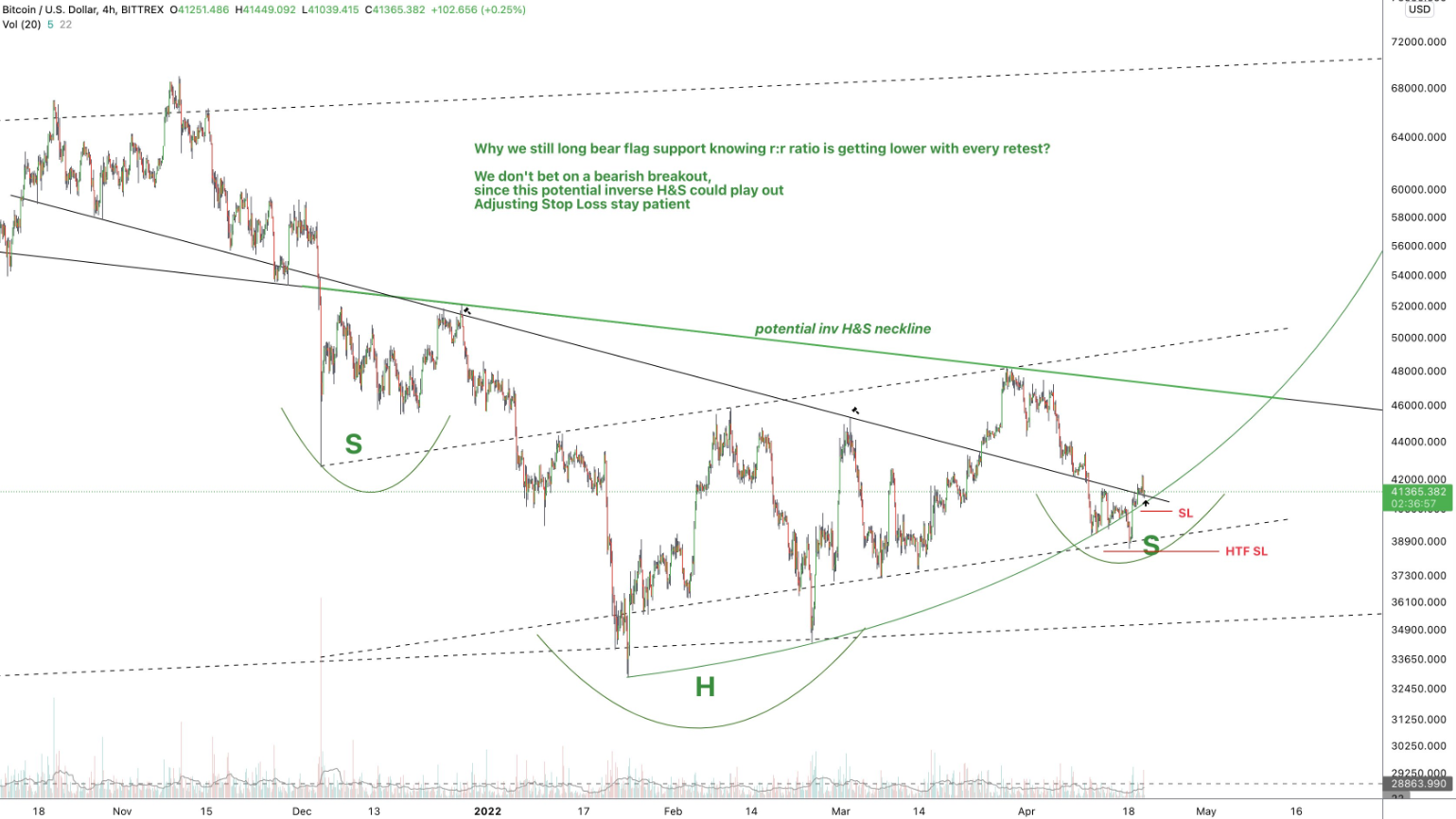 Để thiết lập trường hợp tăng giá, Bitcoin cần “lật thành công S/R của đường xu hướng giảm dần hiện tại” và “lấy lại hỗ trợ lên đến đường viền cổ màu xanh lá cây”, do đó hoàn thành thiết lập đầu và vai nghịch đảo.