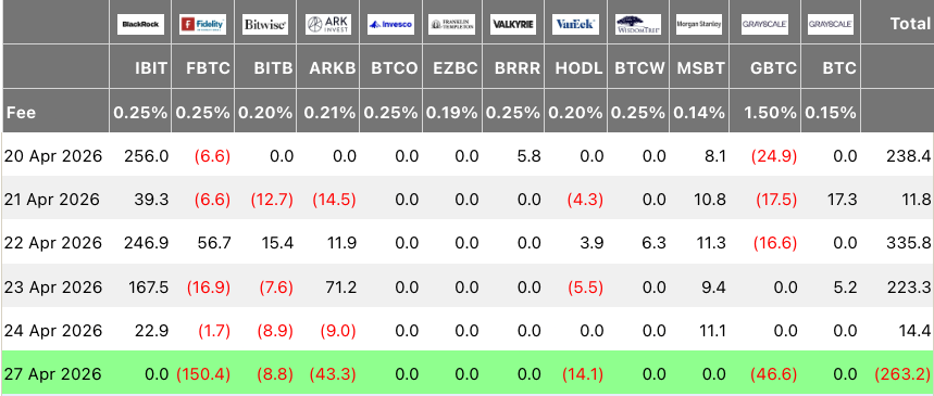 Theo dữ liệu của SoSoValue, các quỹ ETF Bitcoin đã ghi nhận dòng vốn ròng chảy ra ngoài trị giá 263 triệu USD vào thứ Hai, đánh dấu lần chảy vốn ra ngoài đầu tiên kể từ giữa tháng Tư.