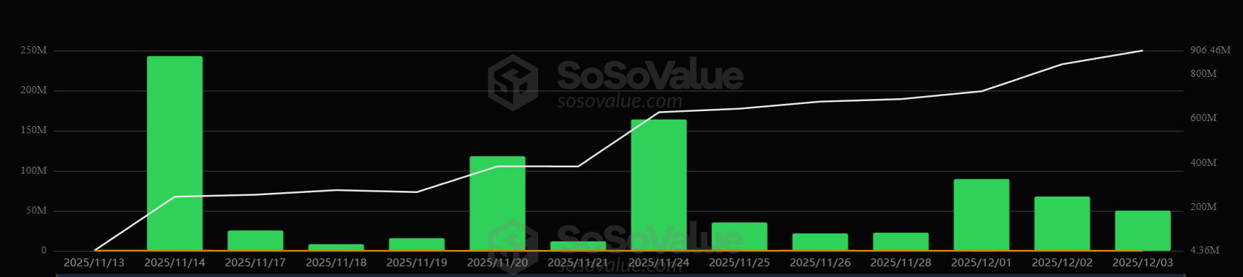Các quỹ ETF spot XRP đã ghi nhận 13 ngày liên tiếp dòng vốn chảy vào, thêm 50,27 triệu USD vào ngày 03/12/2023 và đưa tổng dòng vốn vào đạt 874,28 triệu USD, theo SoSoValue.
