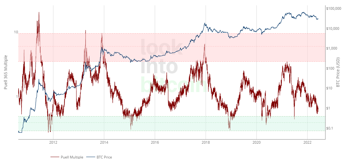 Nếu giá BTC tiếp tục giảm từ đây, tiềm năng tăng bán của thợ đào là không nằm ngoài câu hỏi, như đã được chứng minh trong quá khứ bởi Puell Multiple, là tỷ lệ giữa giá trị phát hành hàng ngày của bitcoin so với trung bình động 365 ngày của giá trị này.