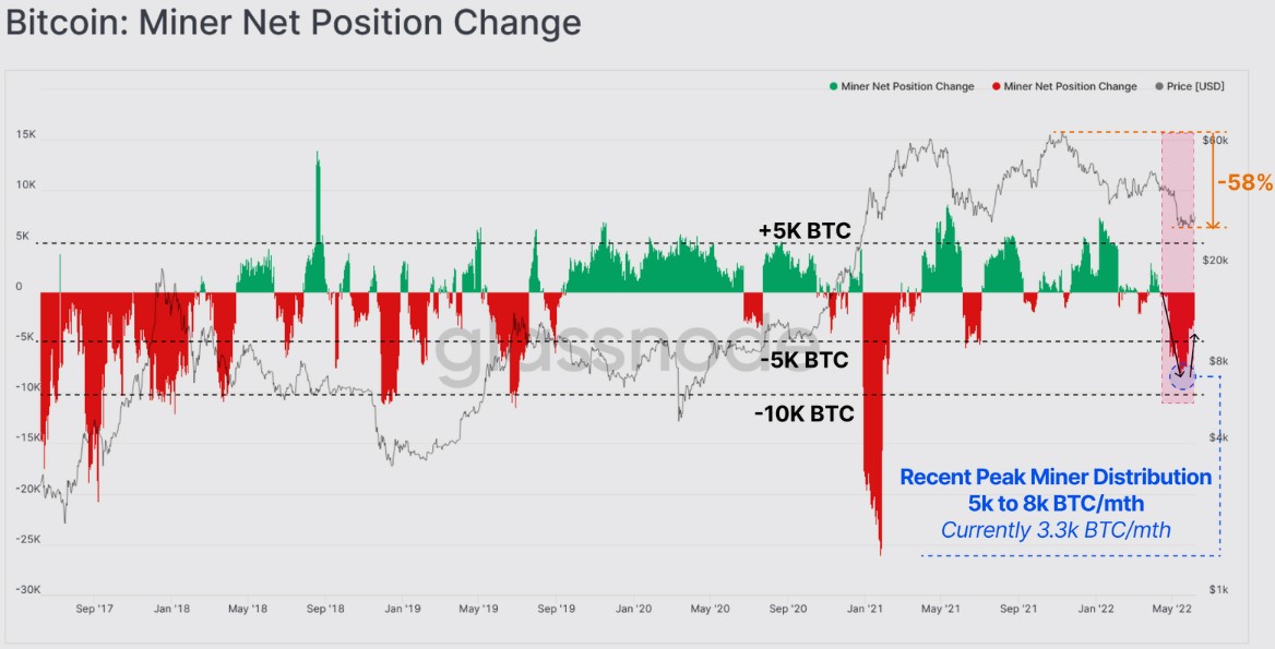 Theo Glassnode, những người khai thác cũng đã bán ròng trong những tháng gần đây vì sự sụt giảm của BTC đã cản trở lợi nhuận của những người khai thác, dẫn đến “tổng số dư của thợ đào giảm từ 5 nghìn đến 8 nghìn BTC mỗi tháng”.