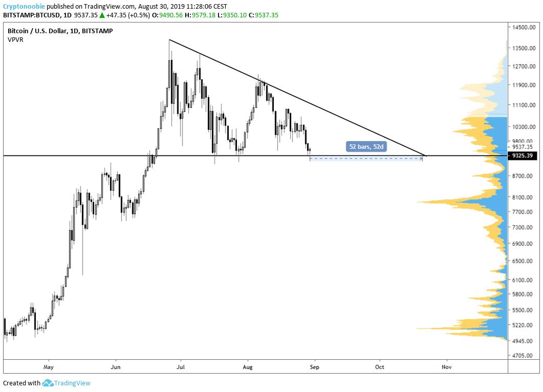 Giá bitcoin đã được giao dịch giữa mức cao thấp hơn và hỗ trợ ở mức 9.300 đô la trong hai tháng qua hoặc lâu hơn, tạo thành một mô hình biểu đồ tam giác giảm dần. Các mẫu biểu đồ này thường giảm giá và cho thấy một sự phá vỡ đối với nhược điểm sắp xảy ra.