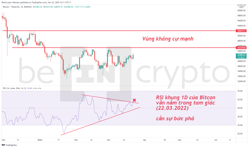 Giá BTC vượt hơn 42,000 USD có thể tạo tâm lý tích cực nhất định cho các nhà đầu tư nhỏ lẻ. Nhưng góc nhìn phân tích kỹ thuật theo RSI, thì Bitcoin vẫn chưa thật sự bức phá.