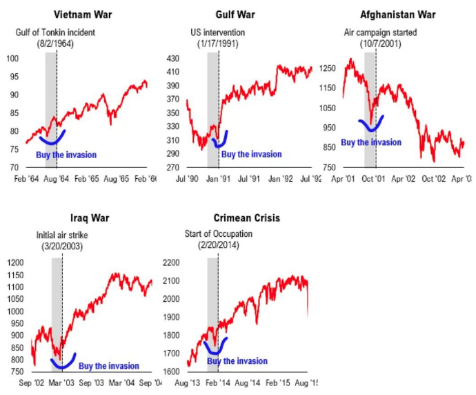 Quan sát của @caprioleio ở góc nhìn khác cho thấy những xung đột vũ trang thường tạo một mô hình giá dạng chữ V. Bảng dưới đây là tổng hợp biến động giá những sự kiện như thế. (BeinCrypto không đưa ra bình luận về cách sử dụng từ ngữ của tác giả trong hình dưới).