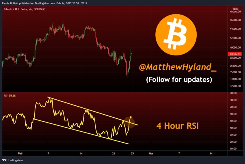 @MatthewHyland_ cho rằng, động thái phục hồi ngày hôm nay đã ghi dấu sự đột phá của chỉ báo RSI của Bitcoin. RSI khung 4h đã chính thức vượt trendline kháng cự của ba tuần liên tiếp. Đây là tín hiệu rất tốt dự báo những đợt phục hồi sắp tới.