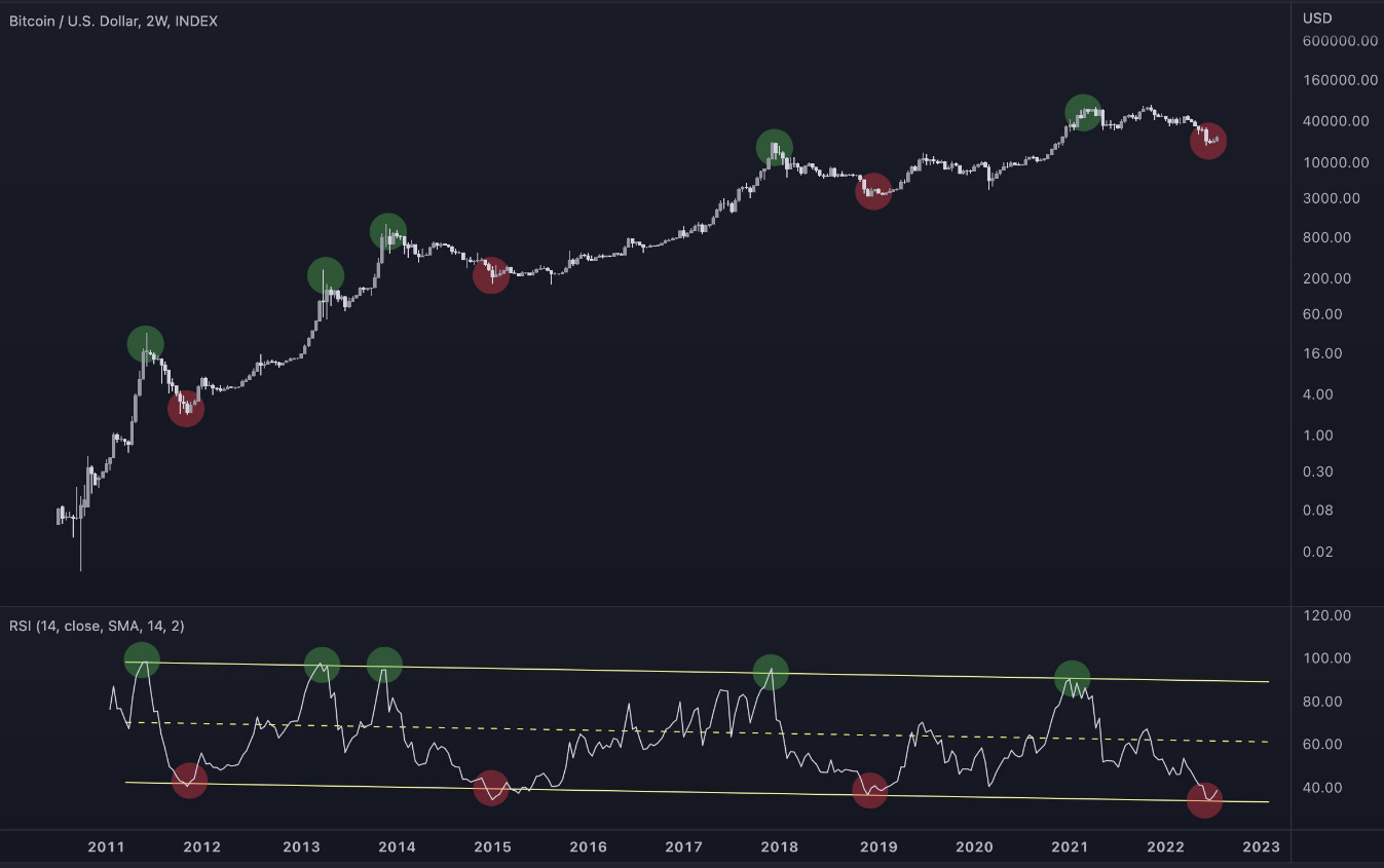 Biểu đồ hai tuần của tiền điện tử cho phép chúng ta xem kênh RSI 11 năm tuổi, đã được thử nghiệm ít nhất bốn lần và hoạt động như một công cụ chính xác để xác định các điểm đảo chiều cục bộ.