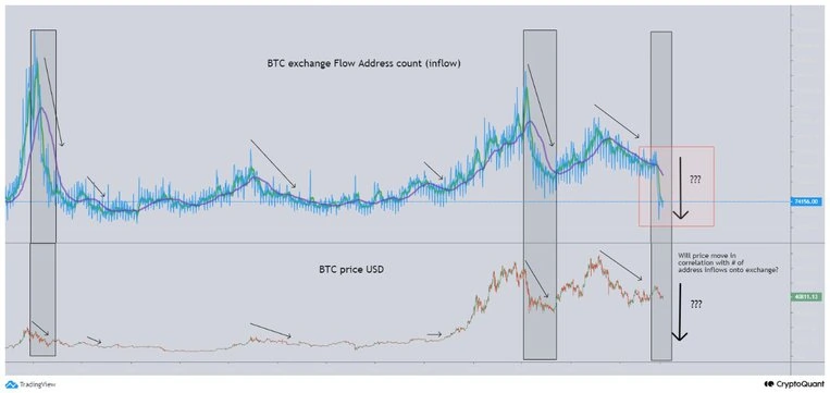 Trong lịch sử, sự sụt giảm lớn về số lượng địa chỉ (dòng vào và dòng ra) dẫn đến sự điều chỉnh giá đáng kể cho BTC.