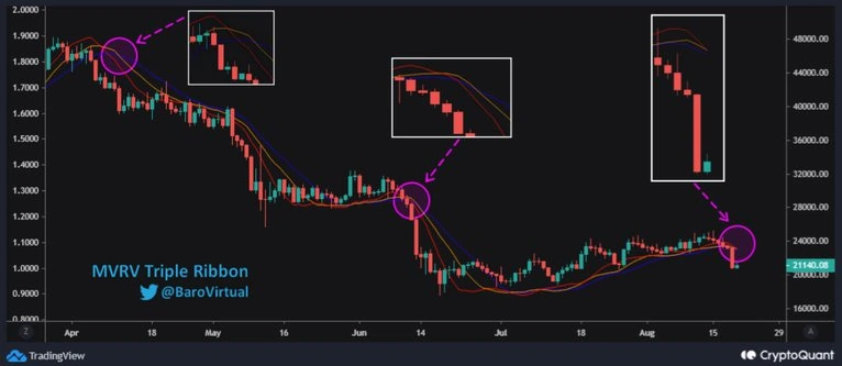 Bitcoin MVR Tripple Ribbon (bao gồm 3MA) lại là một tín hiệu khác, báo trước sự sụp đổ của Bitcoin. Năm nay, theo giả thuyết, đây sẽ là tín hiệu chính thức thứ 5 cho thấy sự suy yếu của Bitcoin và một đợt bán tháo tiếp tục. Tính trung bình, trong năm nay, một tín hiệu tương tự đã dẫn đến việc Bitcoin giảm tới 30%.