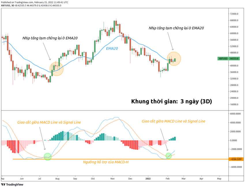 Hiệu quả của tín hiệu trong khung thời gian 3 ngày (3D) có thể kéo dài ít nhất hai tháng. Với những tín hiệu MACD-H tích cực vừa được đường giá cập nhật, các traders có cơ sở dự đoán vùng qua tháng đã là đáy lớn của Bitcoin.