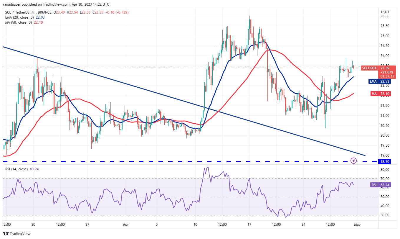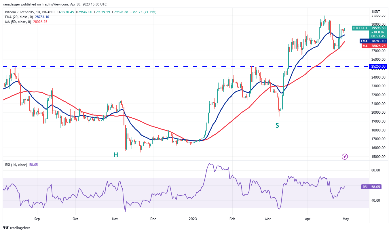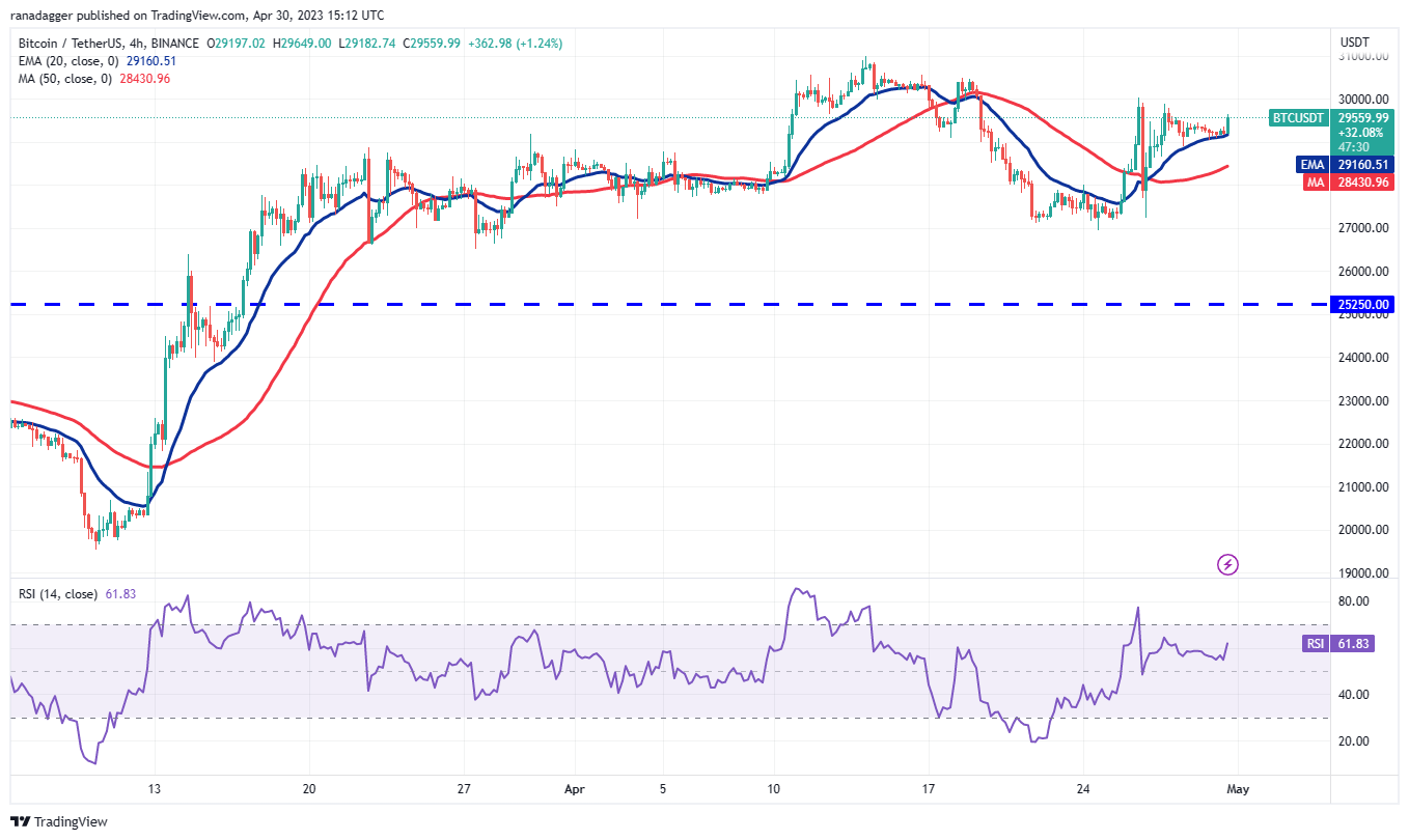 Phe gấu đã cố gắng kéo cặp này xuống dưới đường EMA 20 nhưng phe bò đã giữ vững lập trường của họ. Điều này có thể đã thu hút thêm lực mua và phe bò tiếp theo sẽ cố gắng đẩy giá lên trên 30.000 USD. Nếu họ thành công, Bitcoin có thể tăng lên 30.500 USD hoặc thậm chí 31.000 USD.
