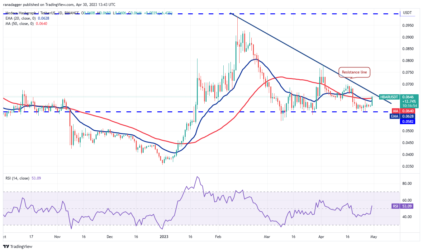 Đường EMA 20 ngày (0,06 USD) đang đi ngang và chỉ số RSI đã leo lên trên điểm giữa, cho thấy áp lực bán đang giảm. Nếu người mua đẩy giá lên trên đường kháng cự, đà tăng có thể tăng lên và cặp HBAR/USDT có thể tăng lên mức kháng cự trên 0,08 USD.