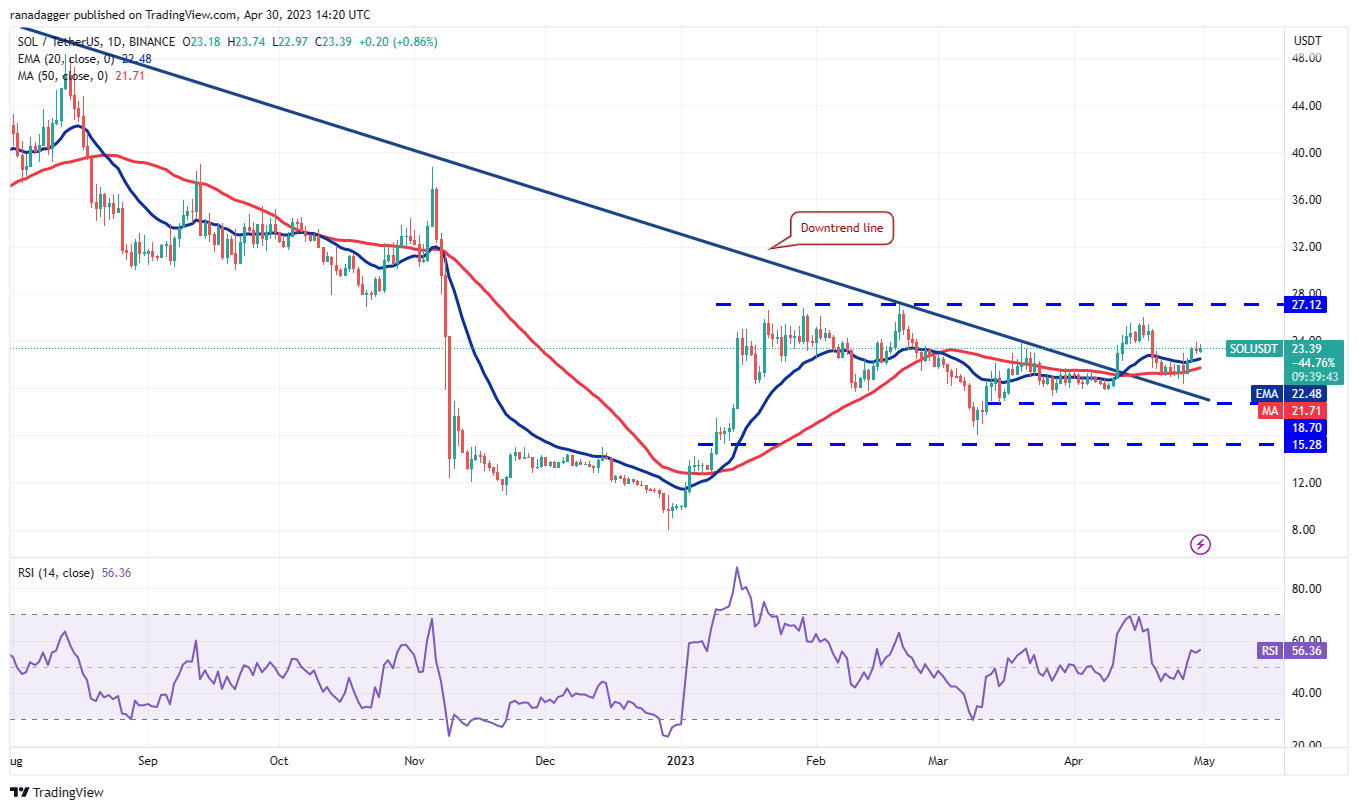 Tiếp theo, người mua sẽ cố gắng đẩy giá lên mức kháng cự trên 27,12 USD. Đây vẫn là mức kháng cự chính cần theo dõi trong thời gian tới bởi vì nếu phe bò đẩy giá lên trên nó, cặp SOL/USDT có thể tăng tốc về mức 39 USD.