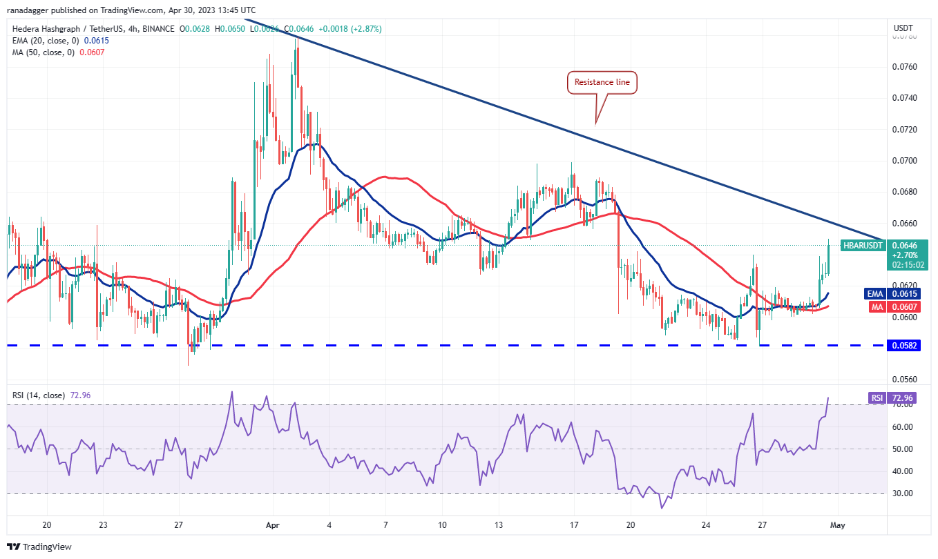 Những con gấu liên tục cố gắng đánh chìm Hedera (HBAR) dưới 0,06 USD nhưng những người đầu cơ giá lên đã giữ vững lập trường của họ. Việc không thể phá vỡ ngưỡng hỗ trợ đã thu hút người mua, những người sẽ cố gắng đẩy giá lên trên đường xu hướng giảm.