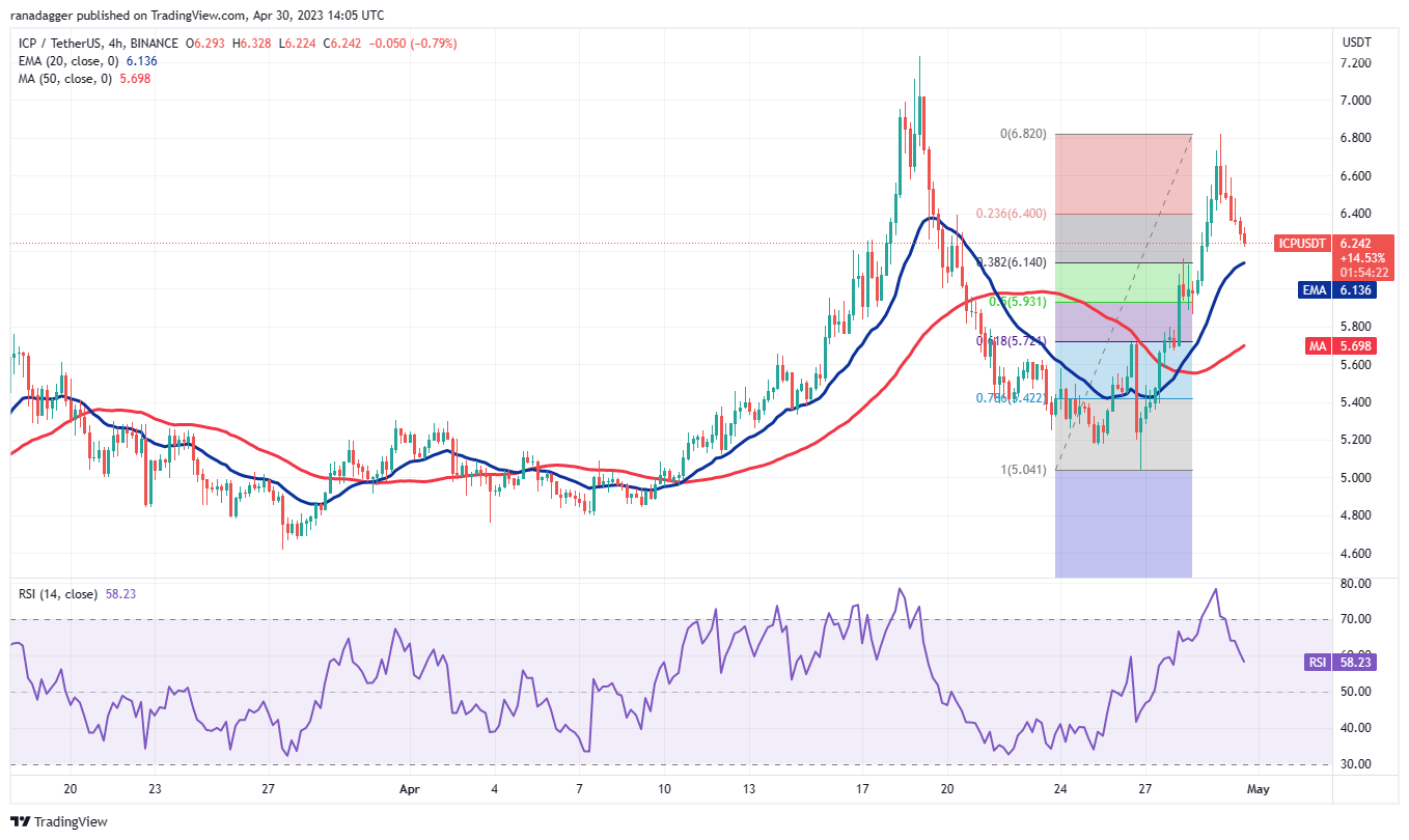 Biểu đồ 4 giờ cho thấy cặp ICP/USDT đang trong giai đoạn điều chỉnh. Hỗ trợ đầu tiên là tại đường 20-EMA, gần với mức thoái lui Fibonacci 38,2% là 6,14 USD. Nếu giá thoát khỏi hỗ trợ này, cặp tiền có thể tăng lên 7,23 USD và cuối cùng là 7,70 USD.