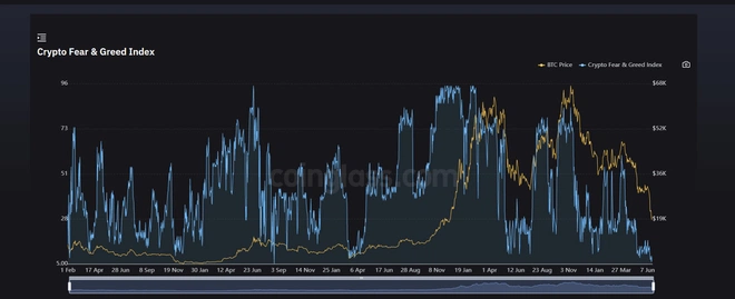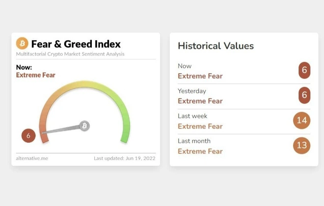 Cụ thể, chỉ số tham lam, sợ hãi của thị trường tiền số nằm ở mức 6/100 vào ngày 19/6, trước khi tăng nhẹ trở lại vào hôm nay, theo Alternative. Kỷ lục điểm số thấp nhất của thị trường là 5/100, được xác lập vào ngày 22/8/2019, khi Bitcoin ở mức 10.000 USD.
