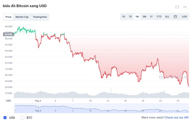 Một lần nữa, việc thị trường chứng khoán Mỹ lao dốc tiếp tục khiến giá Bitcoin sụt giảm mạnh. Theo dữ liệu từ CoinMarketCap, ngay sau khi đóng cửa phiên, giá Bitcoin giảm từ 40.500 USD xuống sát 38.000 USD.